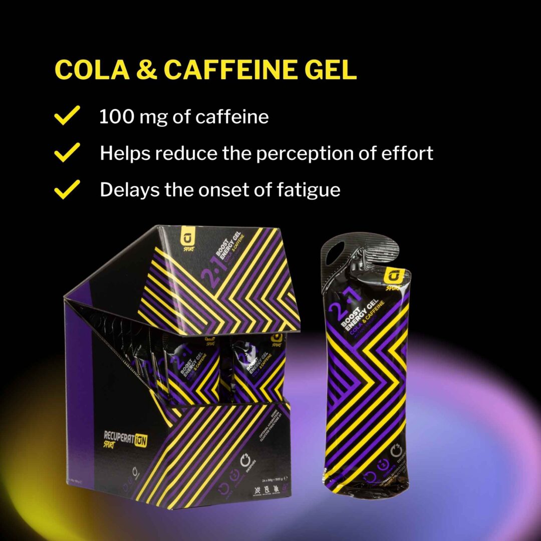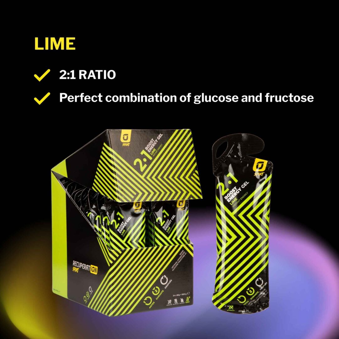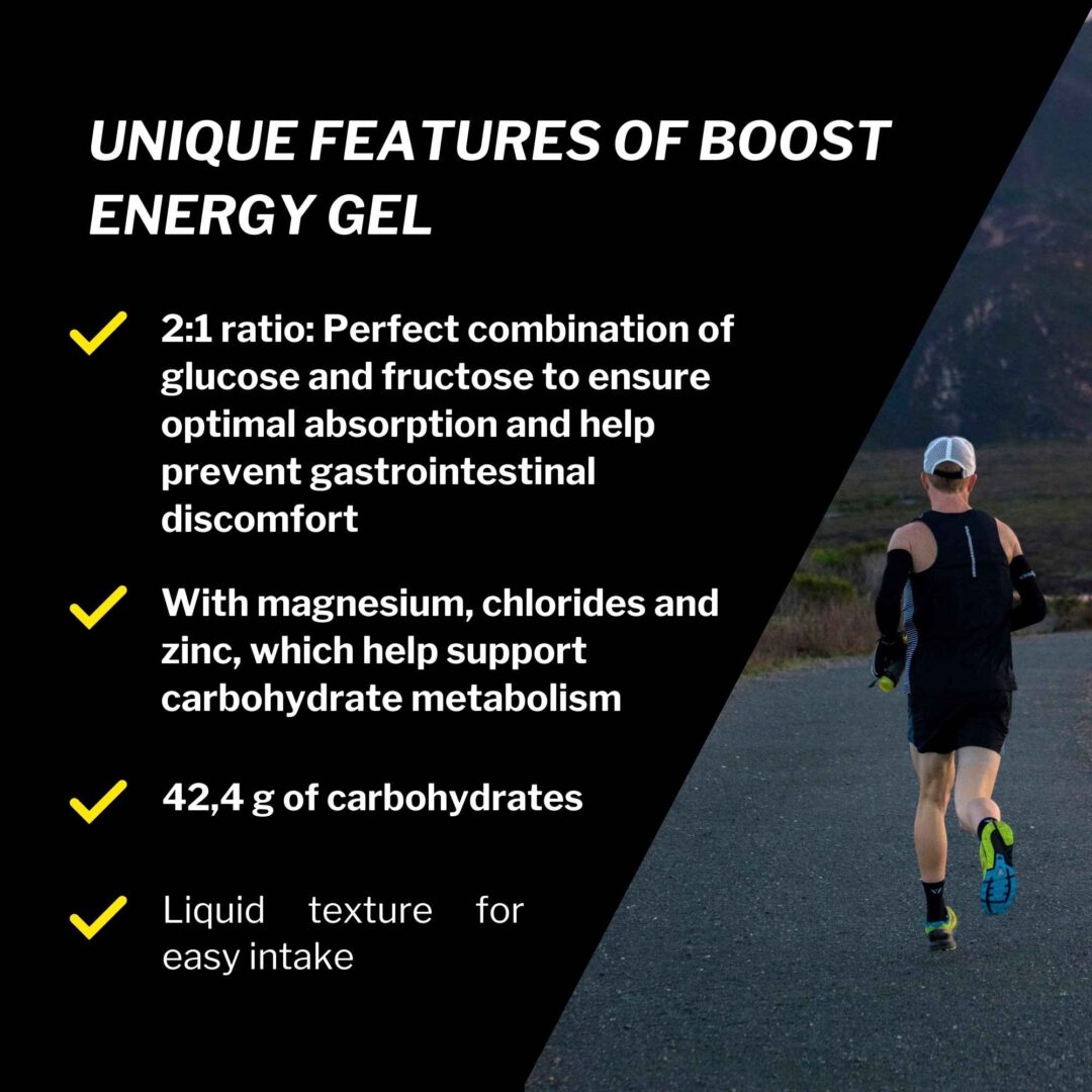Gel Boost Energy is a food supplement for athletes based on fast-absorbing, easily digestible simple carbohydrates, enriched with mineral salts. It is available in three flavours: lime, red fruits and cola (the latter containing 100 mg of caffeine).