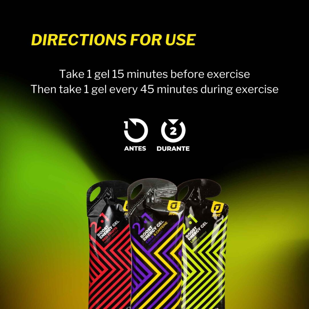Gel Boost Energy is a food supplement for athletes based on fast-absorbing, easily digestible simple carbohydrates, enriched with mineral salts. It is available in three flavours: lime, red fruits and cola (the latter containing 100 mg of caffeine).