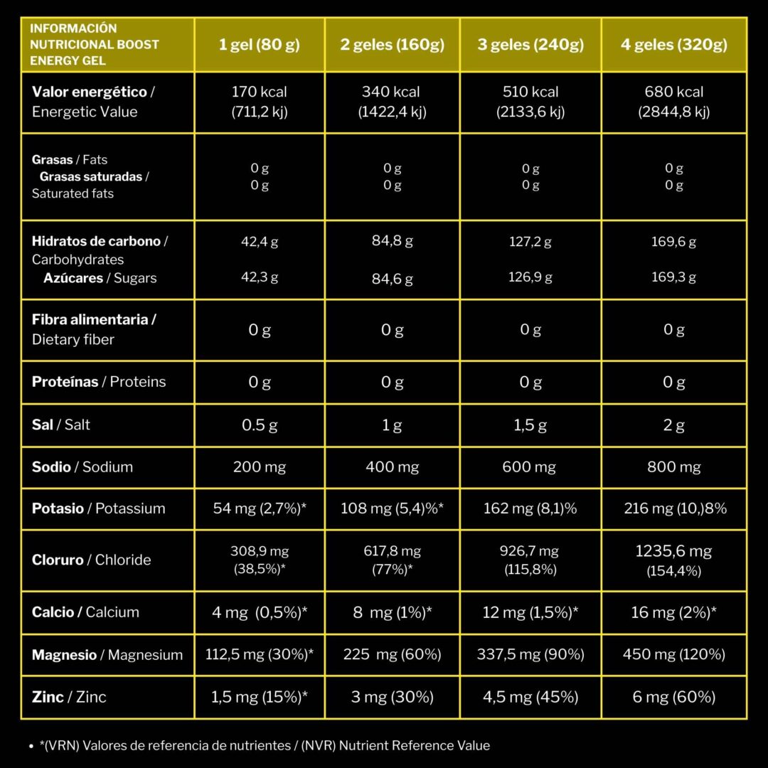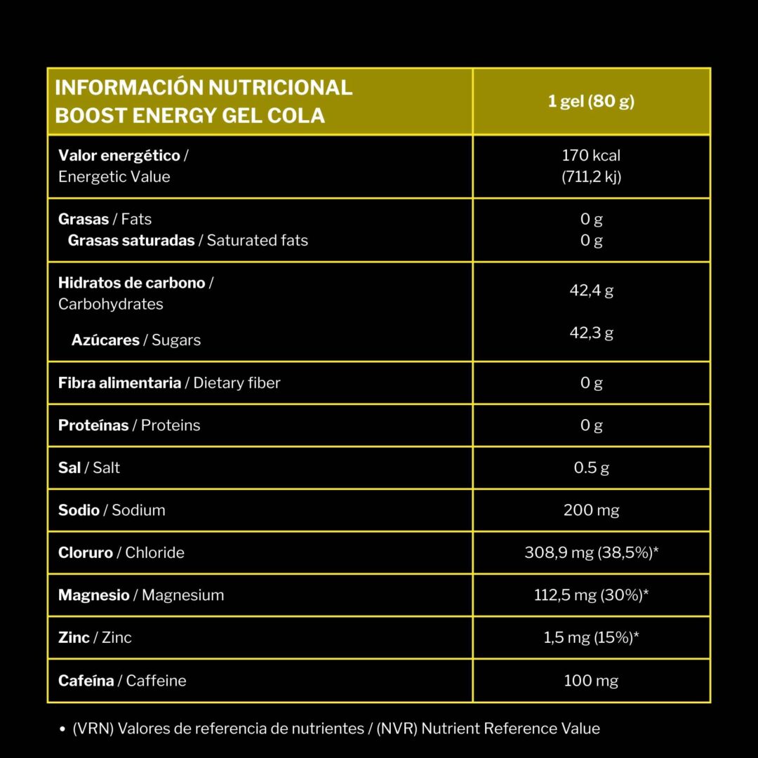 Gel Boost Energy es un complemento alimenticio para deportistas a base de hidratos de carbono simples de rápida asimilación y fácil digestión, enriquecido con sales minerales. Está disponible en tres sabores: lima, frutos rojos y cola (este último con 100 mg de cafeína).