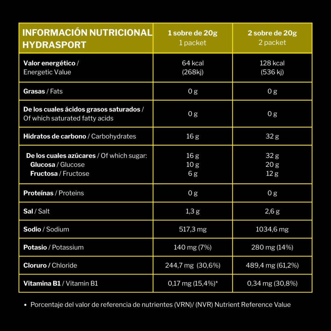 Hydrasport de Recuperation es un complemento alimenticio en forma de bebida hipotónica instantánea en polvo formulada para proporcionar una hidratación óptima antes, durante y después de la práctica deportiva. Este producto se distingue por su óptima concentración en sales minerales y la justa concentración en azúcares, ofreciendo una experiencia mejorada para los deportistas.Sabor: Limón, Naranja y Fresa. Cantidad: 20 Sobres de 20 gramos. Peso neto: 400g